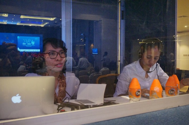 Seperti biasa, pekerjaan penjurubahasaan simultan atau simultaneous interpretation selalu melibatkan dua orang juru bahasa yang bekerja dari dalam bilik juru bahasa atau interpretation booth. Pekerjaan kali ini kembali mempertemukan saya dengan salah satu rekan juru bahasa berpengalaman di Bali, Ayu Septiari. Saya sudah beberapa kali bekerja dalam booth bersama Ayu, dan kami sudah saling cocok dan mengetahui kapasitas serta kebiasaan ketika bekerja bersama. Kecocokan dengan rekan kerja di dalam booth adalah hal penting karena ini memengaruhi kualitas pekerjaan. Jadi, jika mendapat rekan kerja yang belum dikenal, usahakan untuk mengakrabkan diri agar susana dalam booth tidak kaku, dan membicarakan hal teknis yang mendukung pekerjaan yang akan dilakukan bersama, seperti berapa lama waktu yang diperlukan masing-masing juru bahasa untuk menerjemahkan paparan pembicara, etika di dalam booth ketika rekan sedang bekerja dan kita menjalani masa jeda, dan apa yang harus dilakukan ketika ada masalah dengan alat SIS (Simultaneous Interpretation System) yang digunakan.