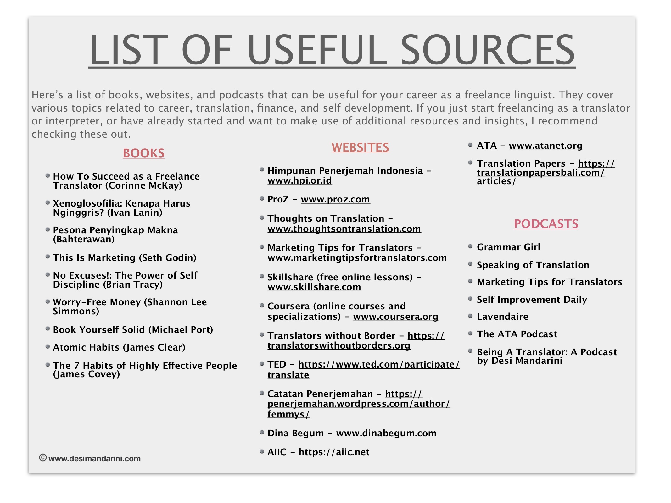 Saya mengumpulkan beberapa sumber pilihan yang menurut saya juga berguna bagi kalian. Tidak semua sumber itu terkait langsung dengan penerjemahan dan bahasa. Saya mencantumkan beberapa sumber informasi tentang keuangan, pengembangan diri, dan kewirausahaan. Kamu bisa melihat daftarnya di bawah ini atau mengunduhnya di sini. Jika kamu mengetahui sumber-sumber bacaan dan materi lain yang menurutmu bermanfaat, tambahkan di bagian komentar agar yang lain juga mengetahui dan bisa memanfaatkannya.