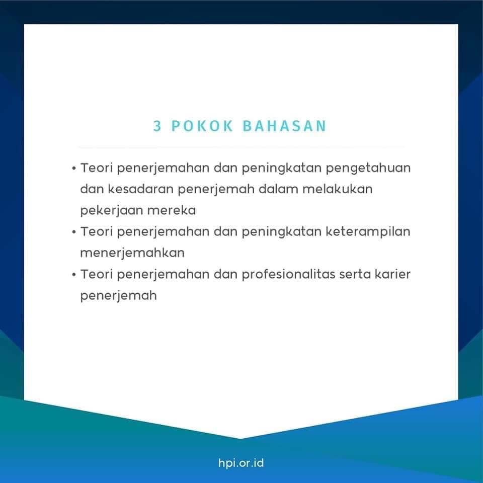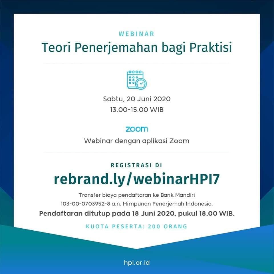 Pada tanggal 20 Juni 2020, HPI Pusat akan kembali menggelar webinar untuk pengembangan profesi penerjemah. Bila Anda tertarik untuk mengetahui teori penerjemahan guna menambah bekal dalam menjalani profesi sebagai penerjemah, silakan segera mendaftar. Webinar ini dibuka untuk 200 orang peserta dan pendaftaran akan ditutup pada tanggal 18 Juni 2020.